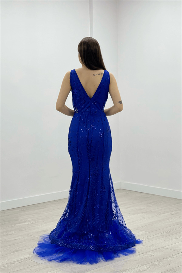 Payet Kumaş Eteği Tül Detaylı Elbise - SAKS MAVİ