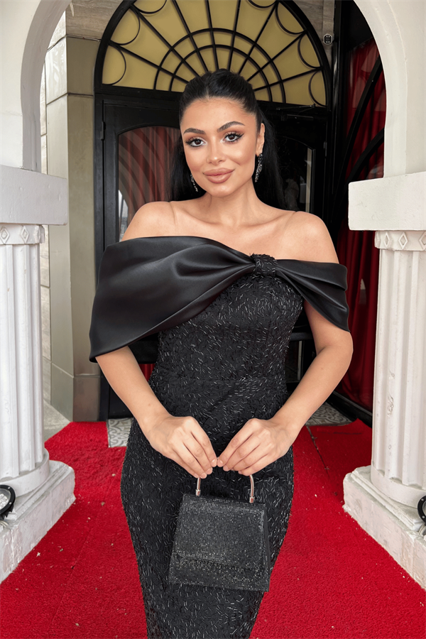 Payet Kumaş Saten Kayık Yaka Kalem Elbise - SİYAH