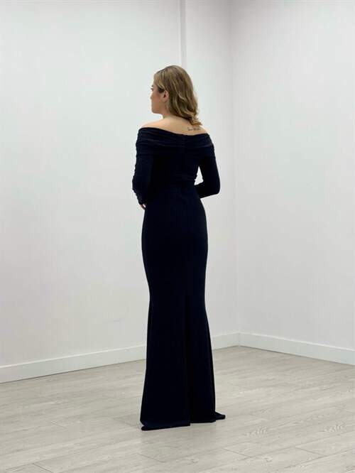 Pırıltı Kumaş Kayık Yaka Balık Elbise - SİYAH
