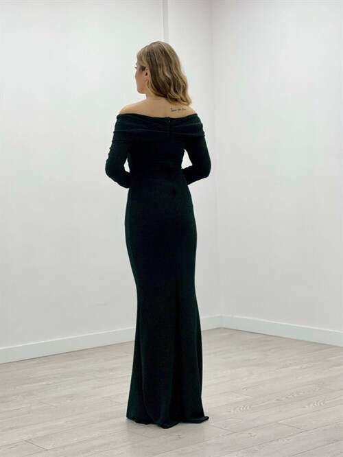 Pırıltı Kumaş Kayık Yaka Balık Elbise - ZÜMRÜT YEŞİL