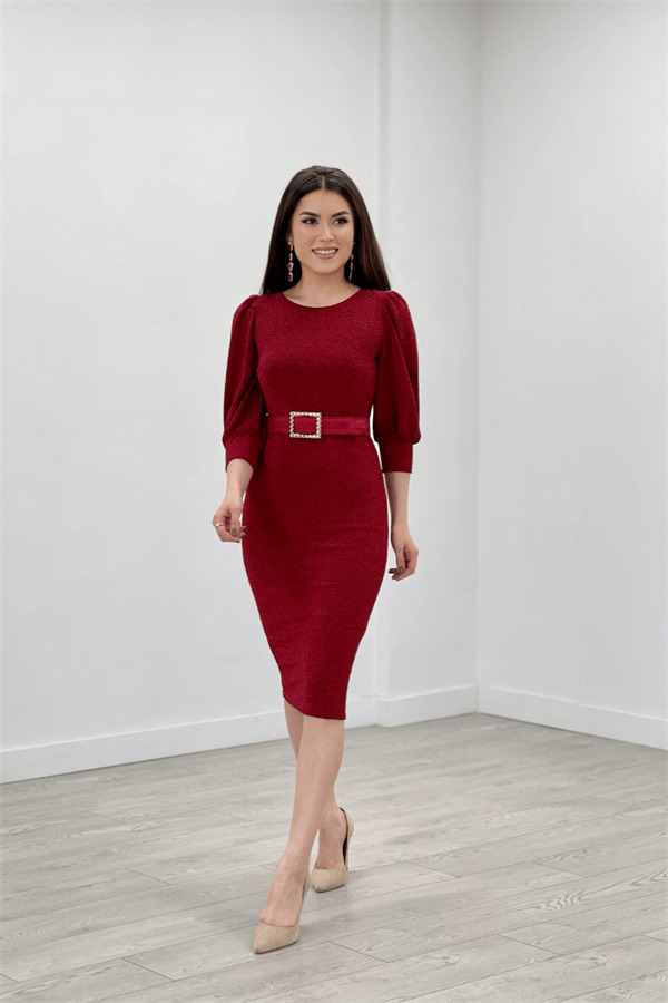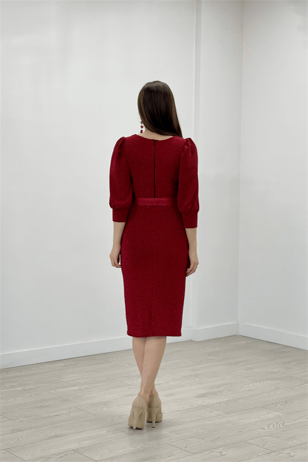 Pırıltılı Kumaş Kolları Balon Detaylı Kalem Elbise - KIRMIZI