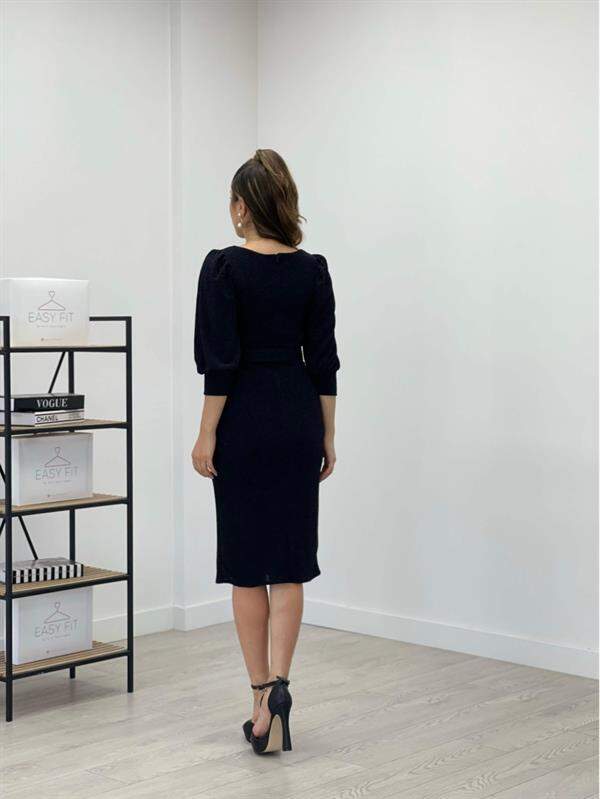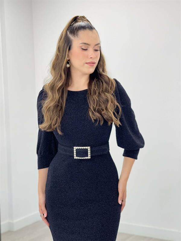 Pırıltılı Kumaş Kolları Balon Detaylı Kalem Elbise - SİYAH