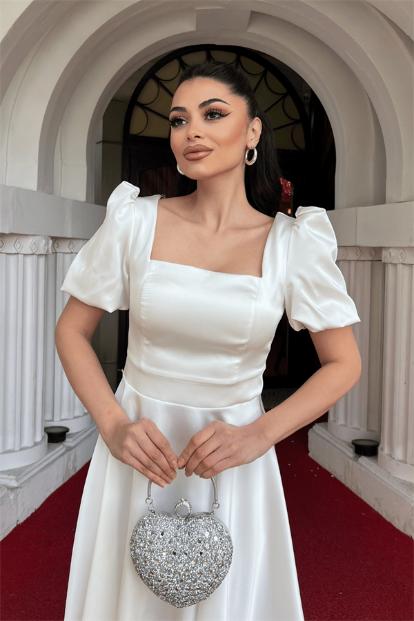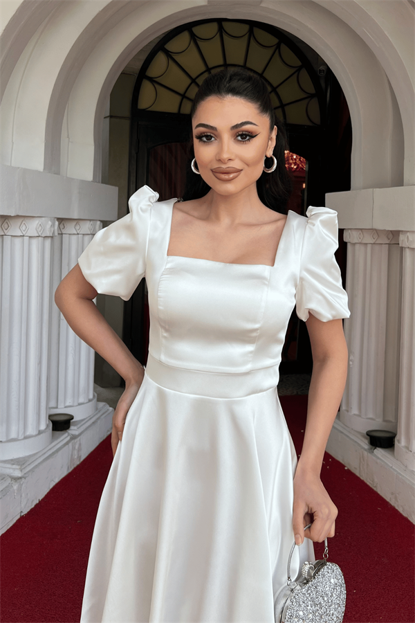 Saten Kumaş Balon Kol Mini Elbise - BEYAZ