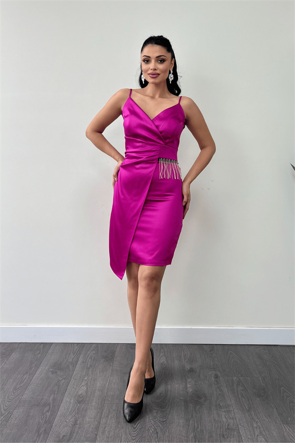 Saten Kumaş Boncuk Detaylı Elbise - FUŞYA