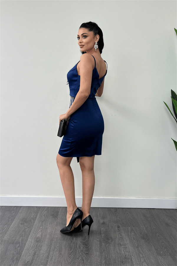 Saten Kumaş Boncuk Detaylı Elbise - LACİVERT