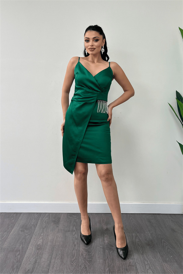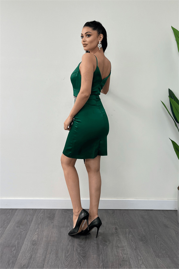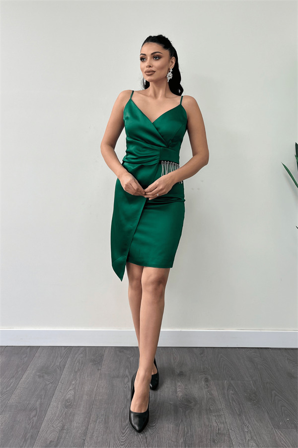 Saten Kumaş Boncuk Detaylı Elbise - ZÜMRÜT YEŞİL