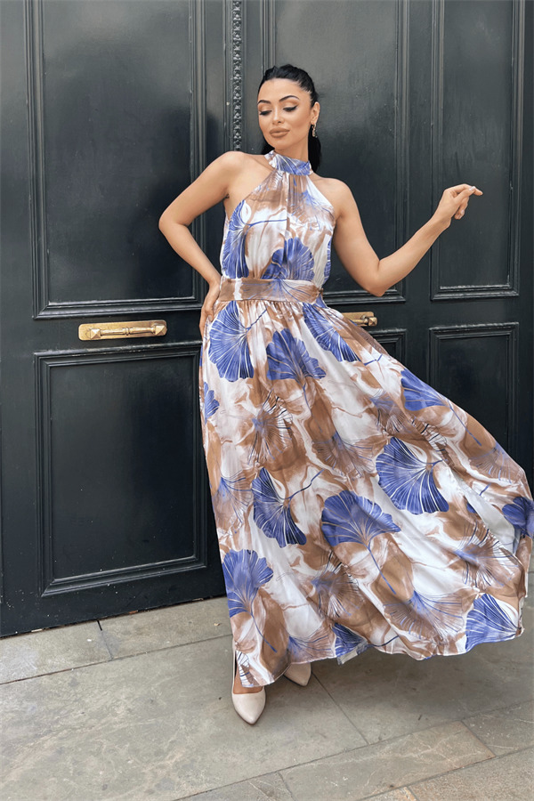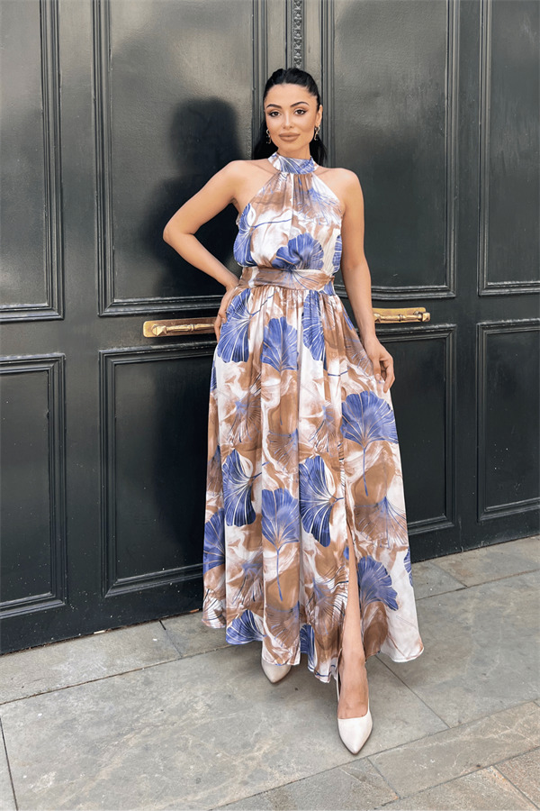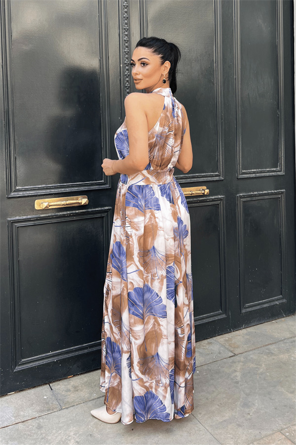 Saten Kumas Boyundan Bağlamalı Elbise - MAVİ