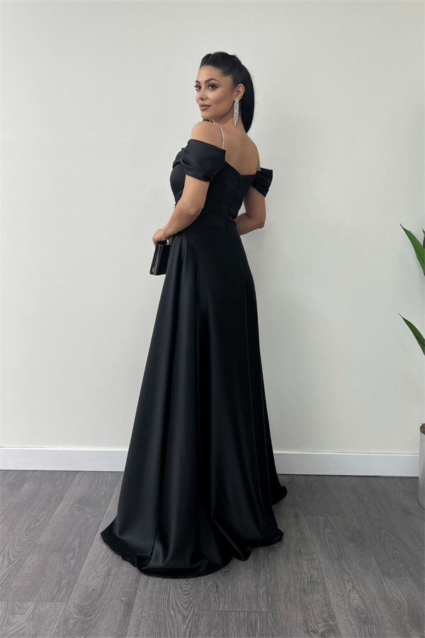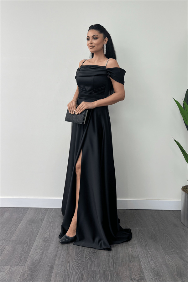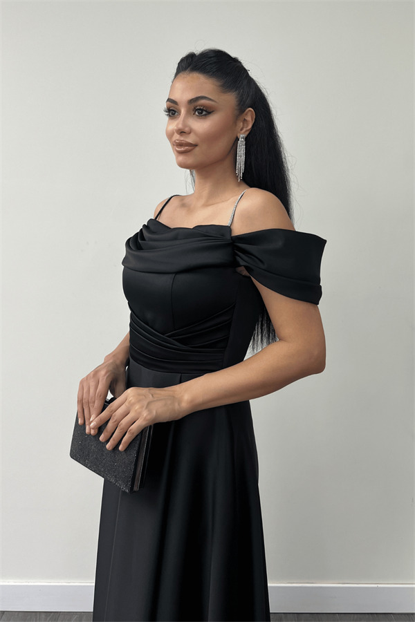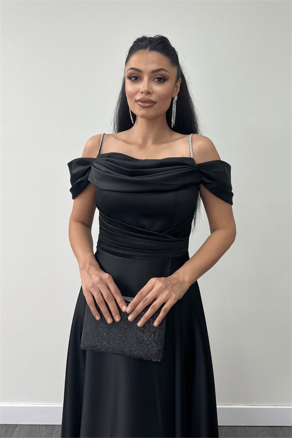 Saten Kumaş Büzgülü Askılı Abiye Elbise - SİYAH