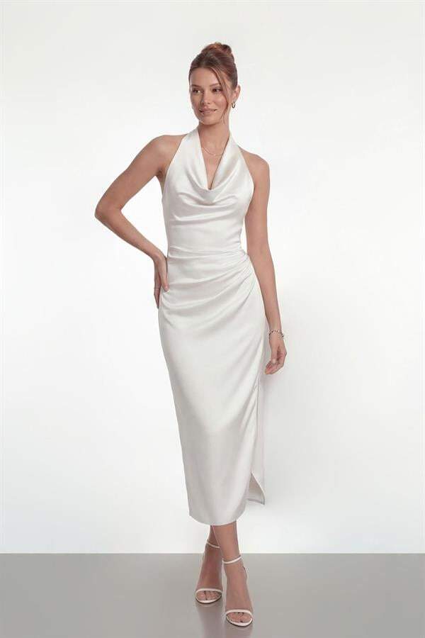 Saten Kumaş Degaje Yaka Elbise - BEYAZ
