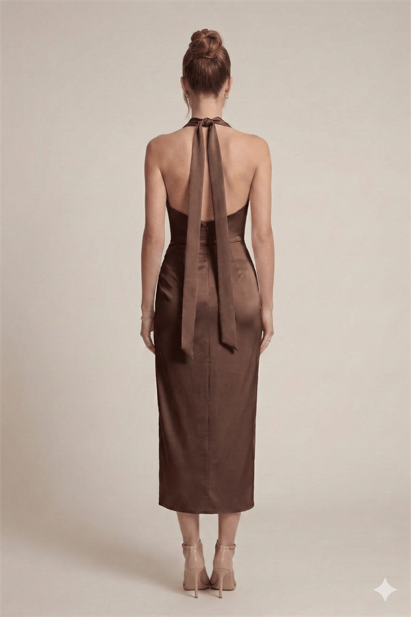 Saten Kumaş Degaje Yaka Elbise - KAHVERENGİ