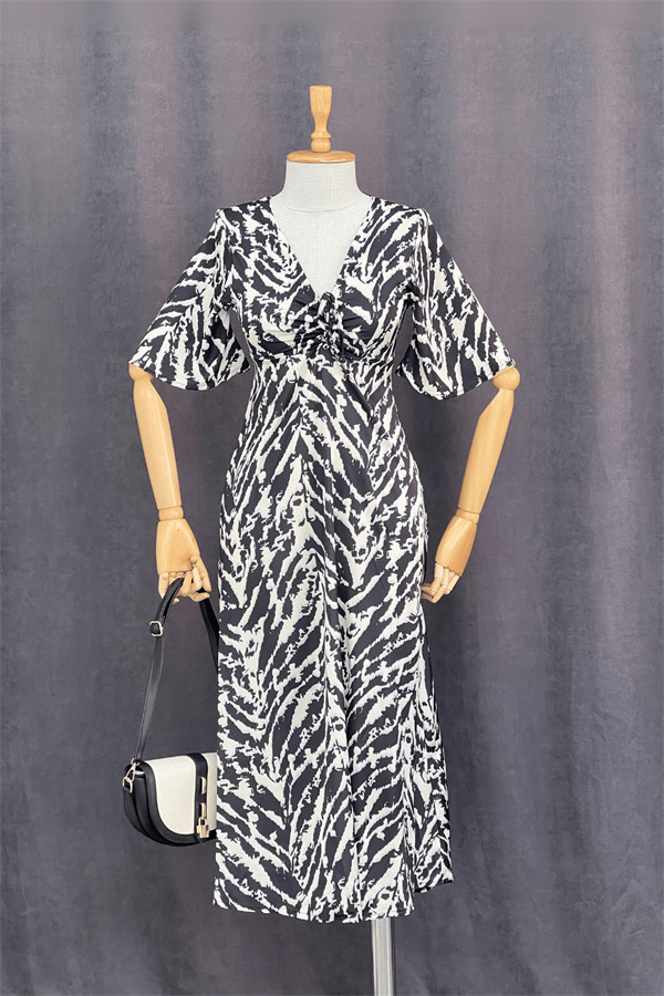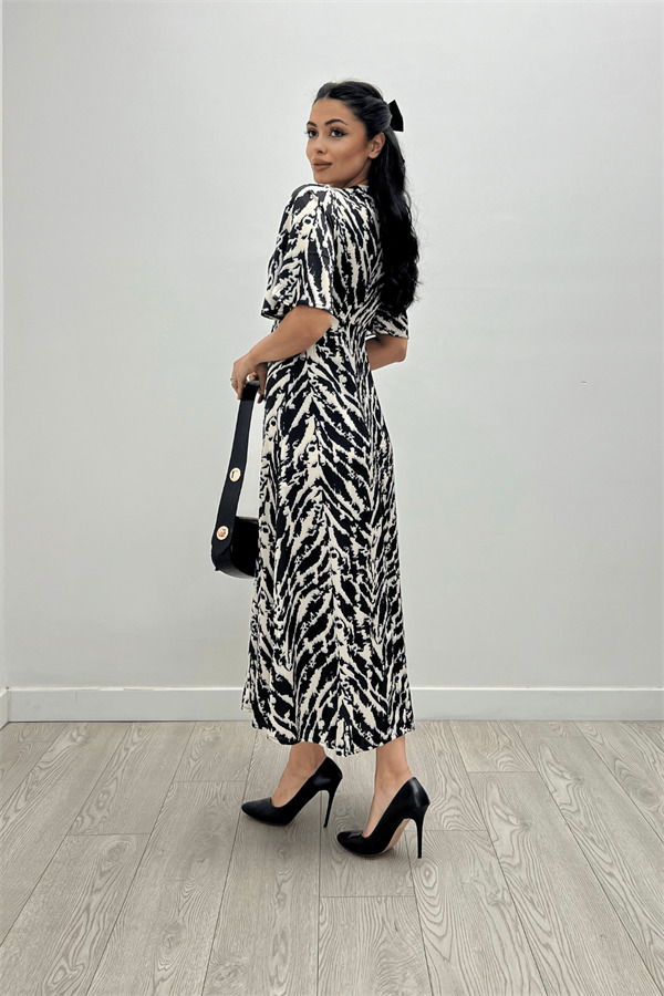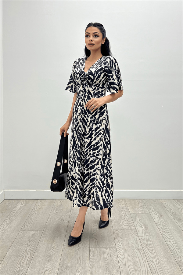 Saten Kumaş Göğsü Büzgü Detaylı Elbise - SİYAH