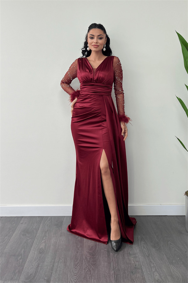 Saten Kumaş Kolları Otrişli Boncuk Detaylı Balık Elbise - BORDO
