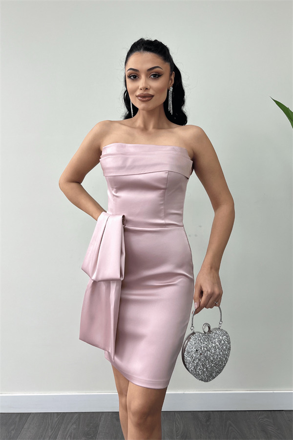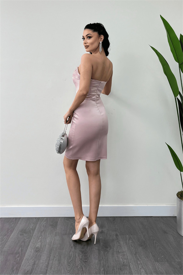 Saten Kumaş Straplez Mini Elbise - PUDRA