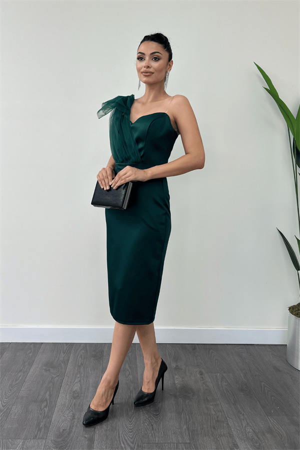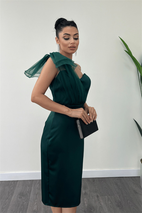 Saten Kumaş Straplez Tül Detaylı Kalem Elbise - ZÜMRÜT YEŞİL