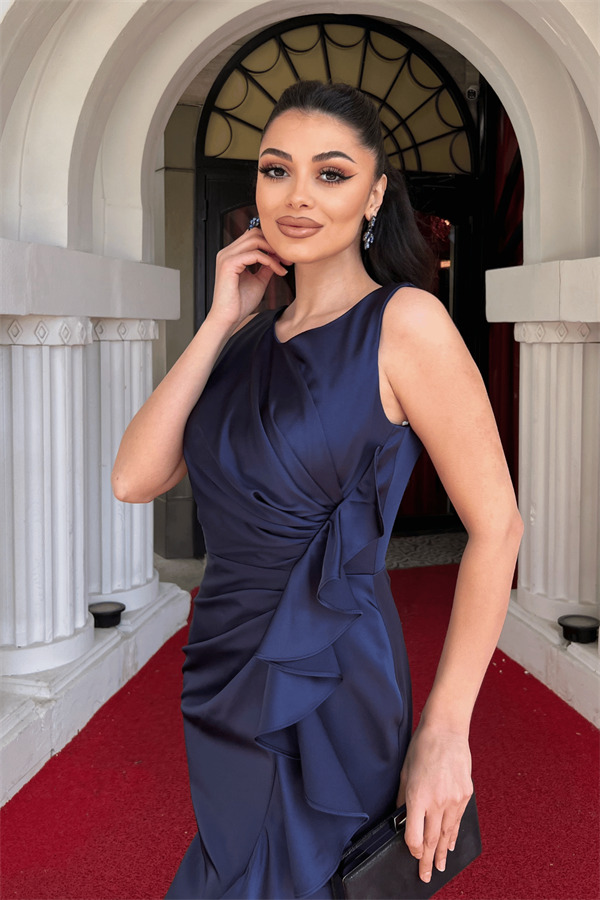 Saten Kumaş Volan Detaylı Balık Elbise - LACİVERT