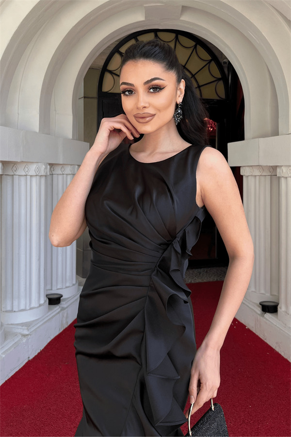 Saten Kumaş Volan Detaylı Balık Elbise - SİYAH