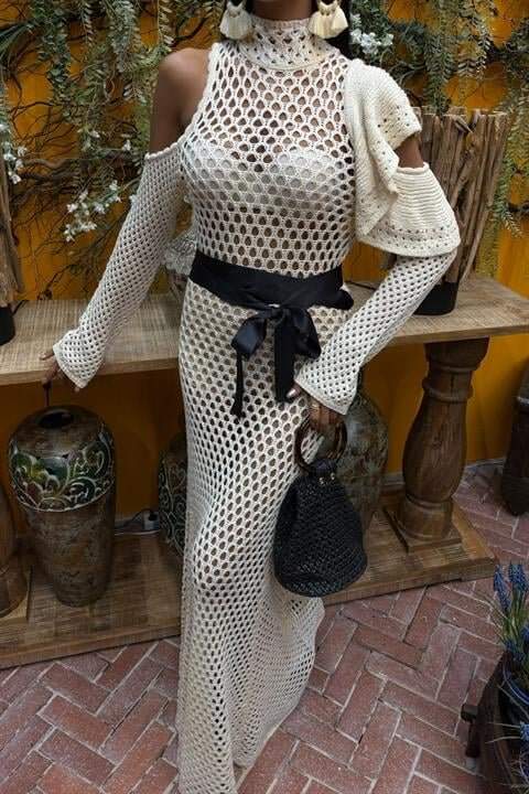 Saten Kuşaklı Ajurlu Triko Elbise 2847