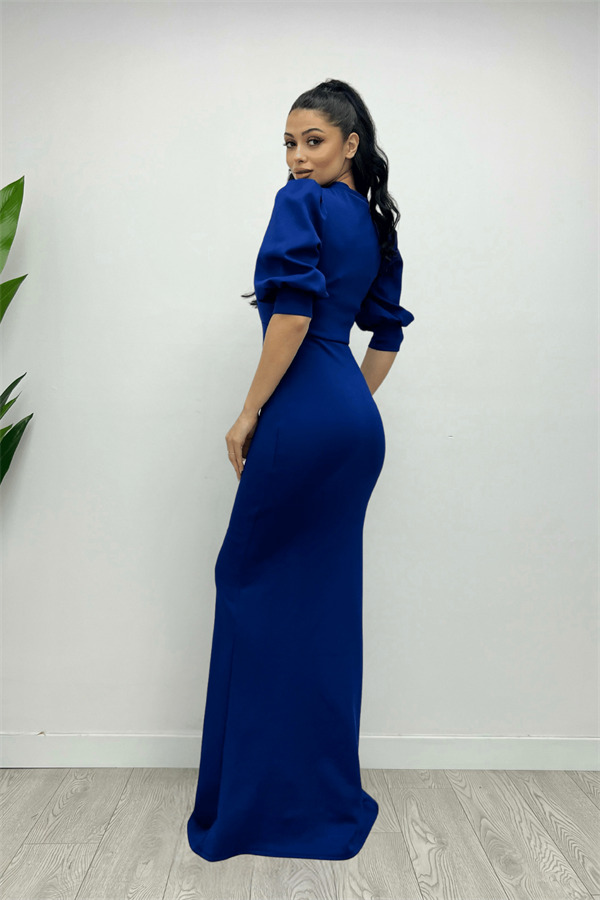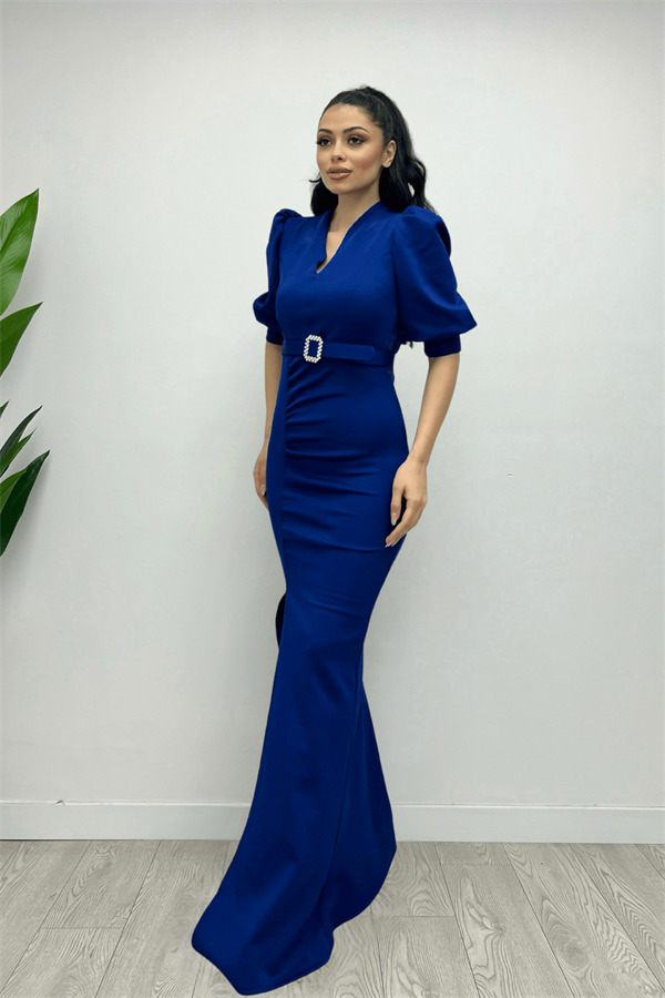 Scuba Kumaş Dik Yaka Elbise - SAKS MAVİ