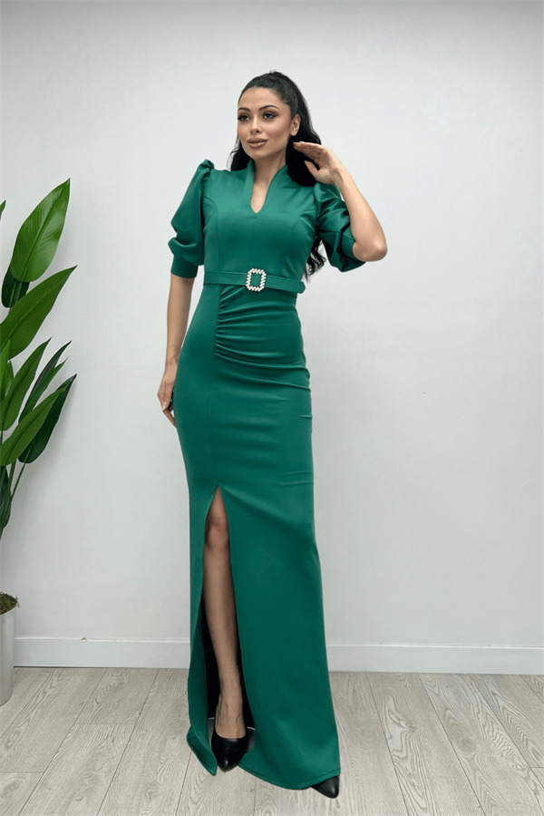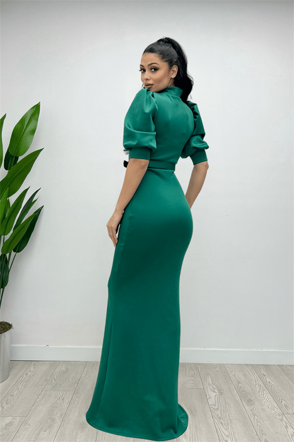 Scuba Kumaş Dik Yaka Elbise - ZÜMRÜT YEŞİL