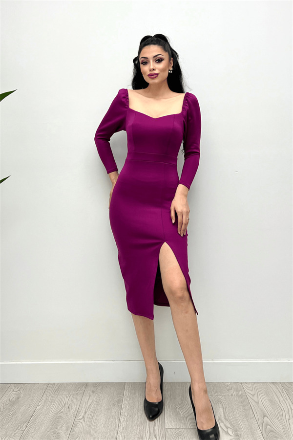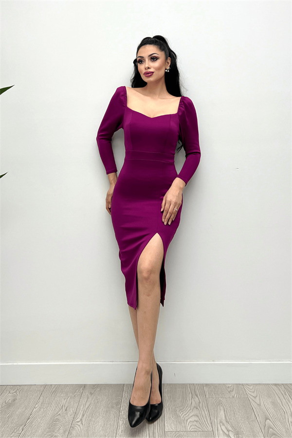 Scuba Kumaş Yırtmaç Detaylı Elbise - Mürdüm