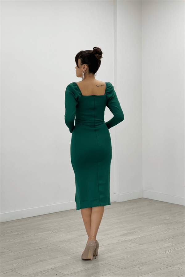 Scuba Kumaş Yırtmaç Detaylı Elbise - ZÜMRÜT YEŞİL