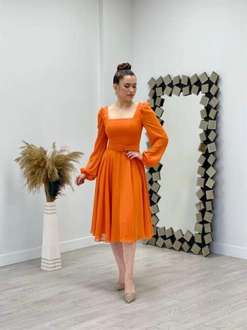 Şifon Krep Kumaş Kare Yaka Midi Elbise