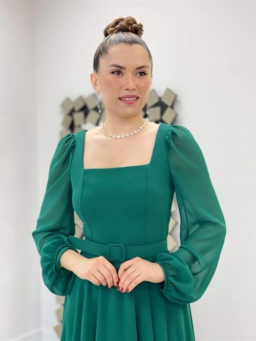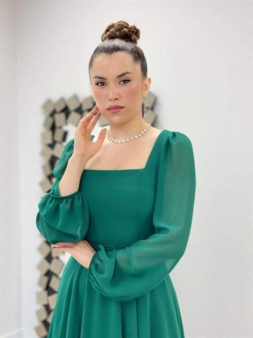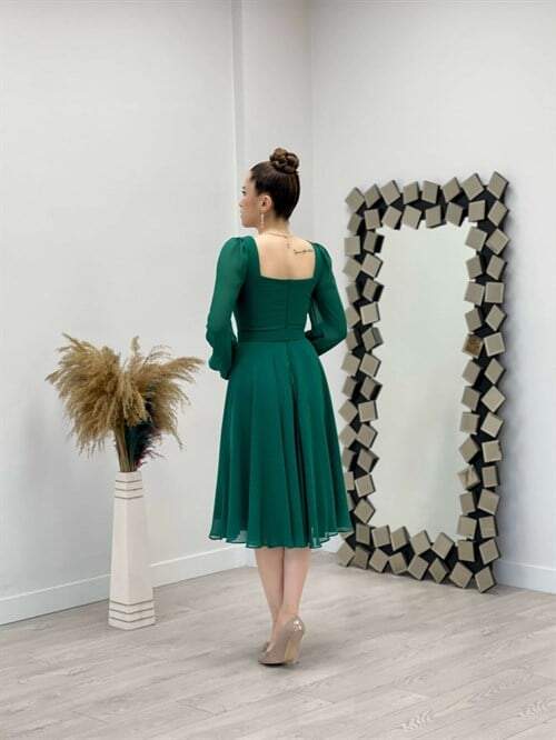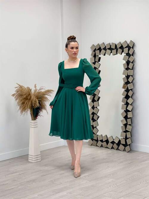 Şifon Krep Kumaş Kare Yaka Midi Elbise - ZÜMRÜT YEŞİL