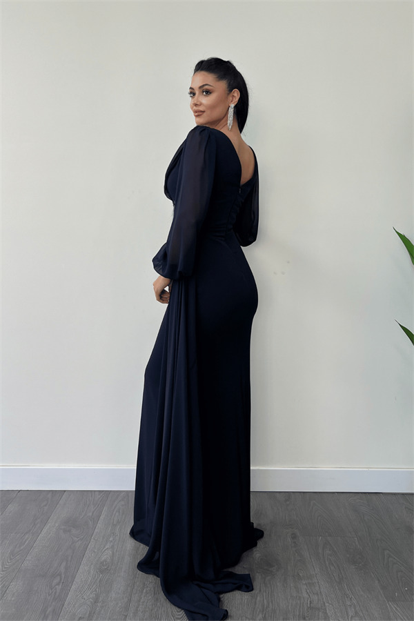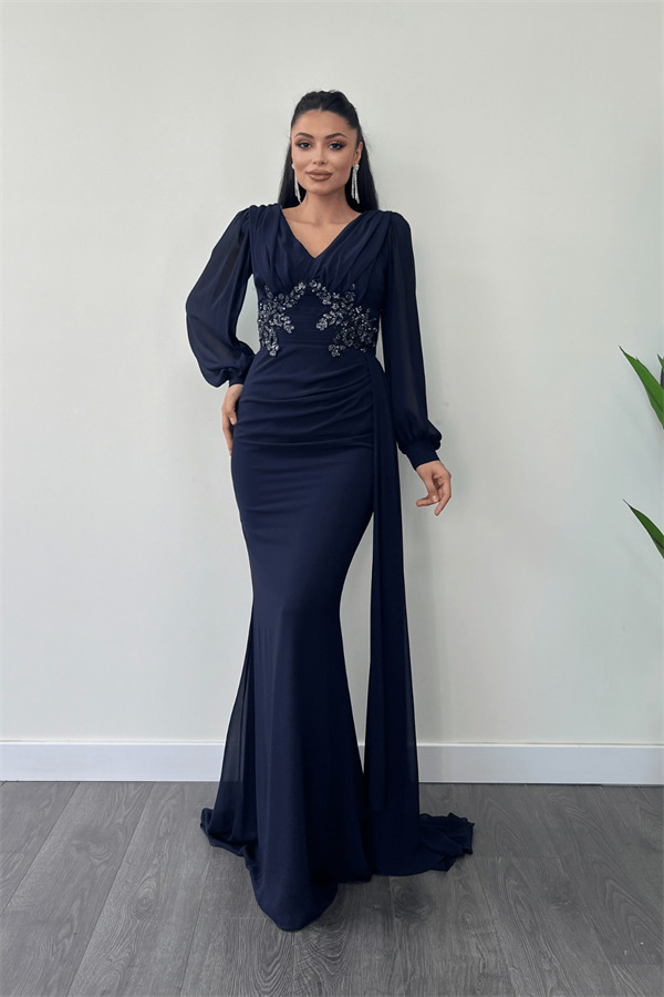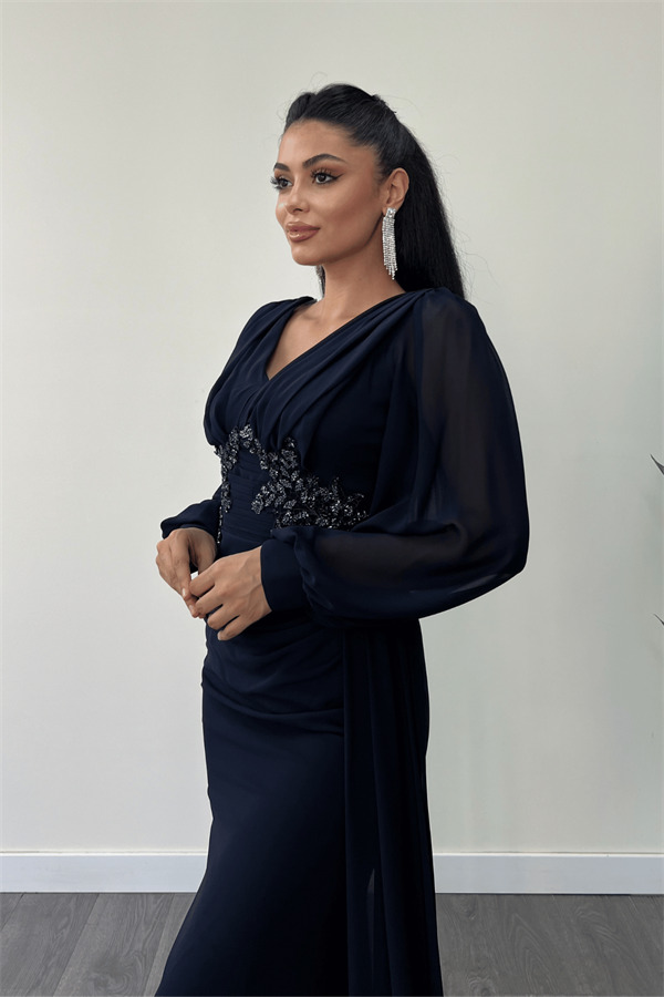 Şifon Kumaş Boncuk İşlemeli Şal Detaylı Abiye Elbise - LACİVERT