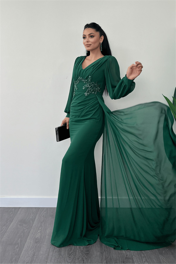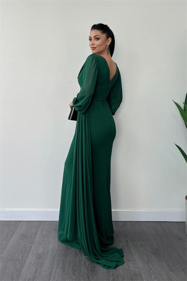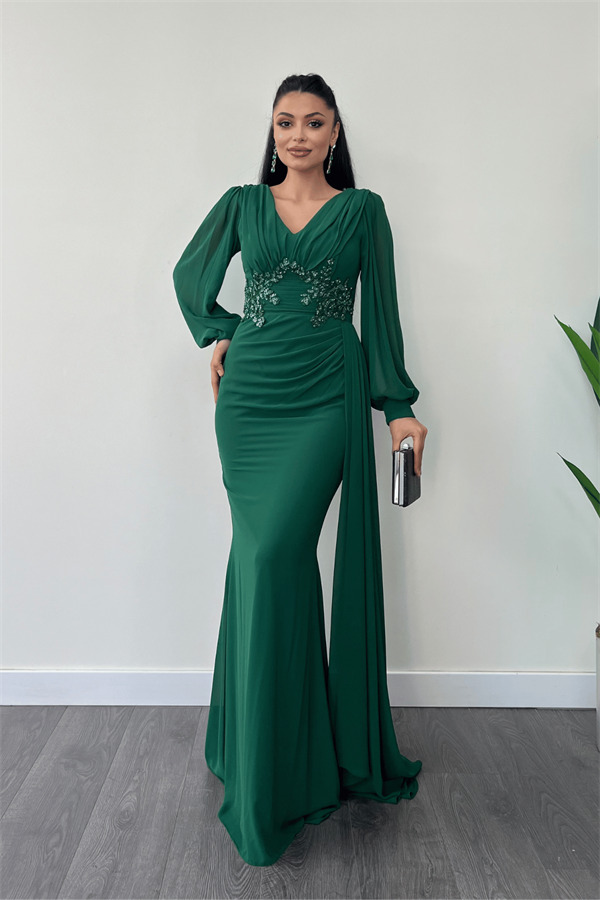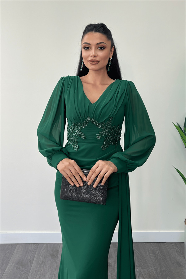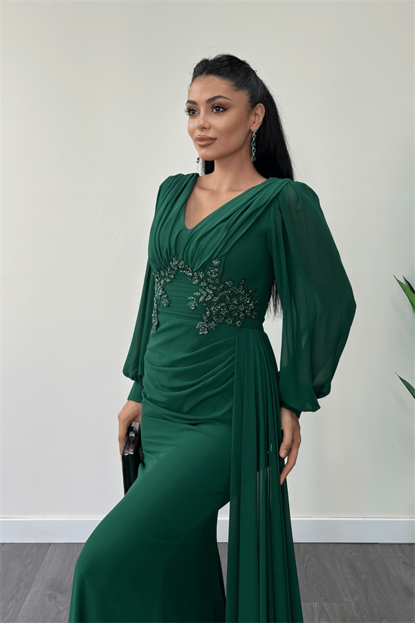 Şifon Kumaş Boncuk İşlemeli Şal Detaylı Abiye Elbise - ZÜMRÜT YEŞİL