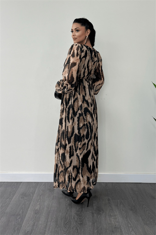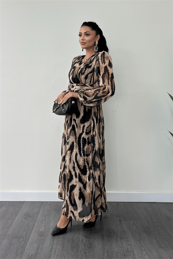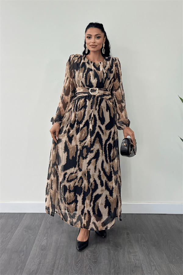 Şifon Kumaş Kemer Detaylı Maxi Elbise - KAHVERENGİ