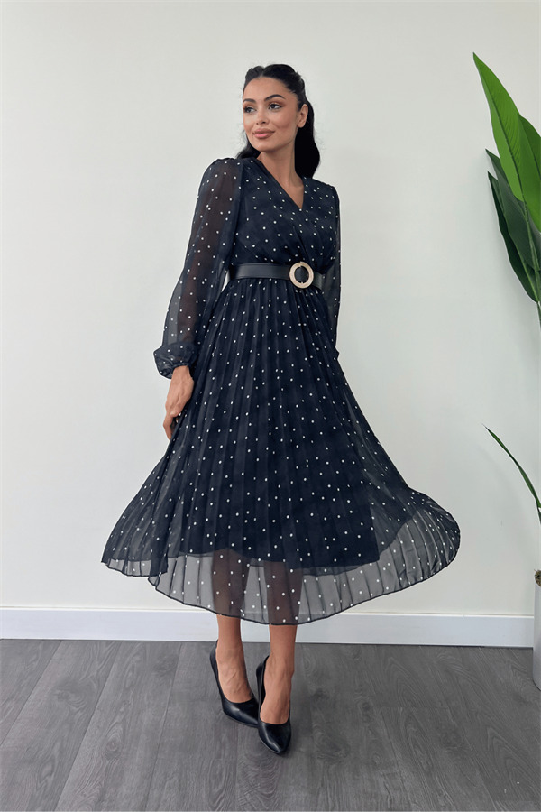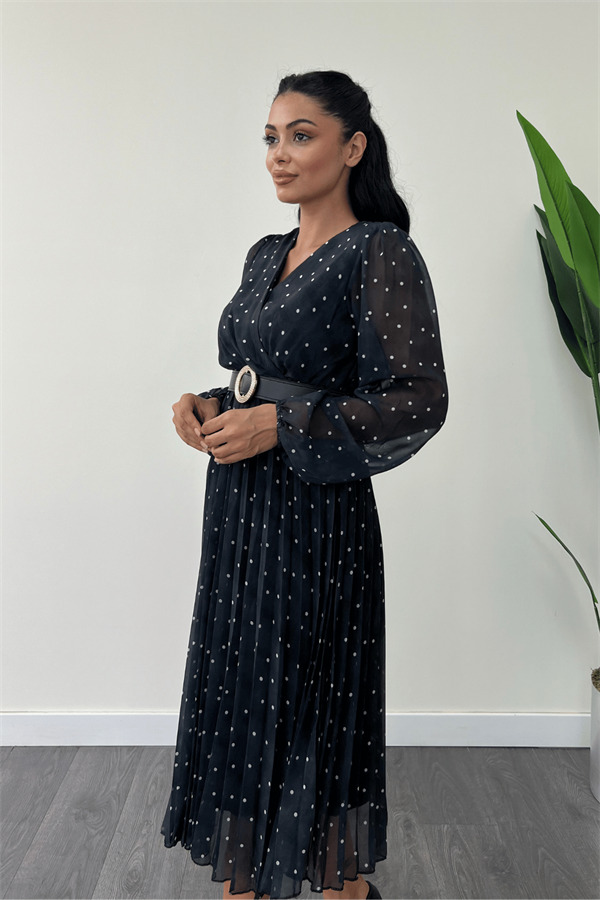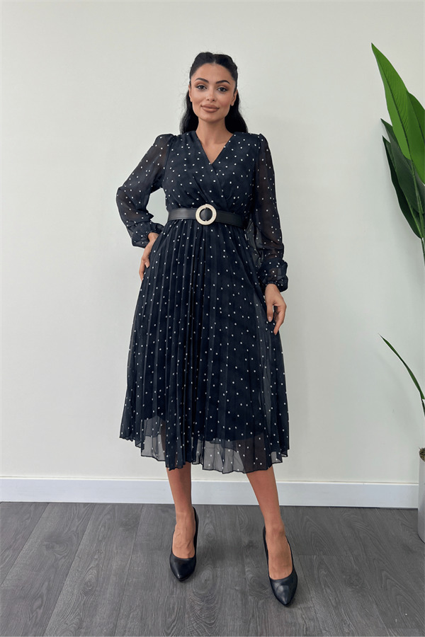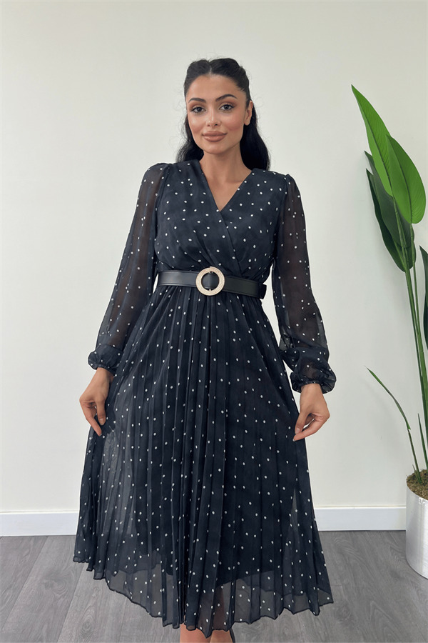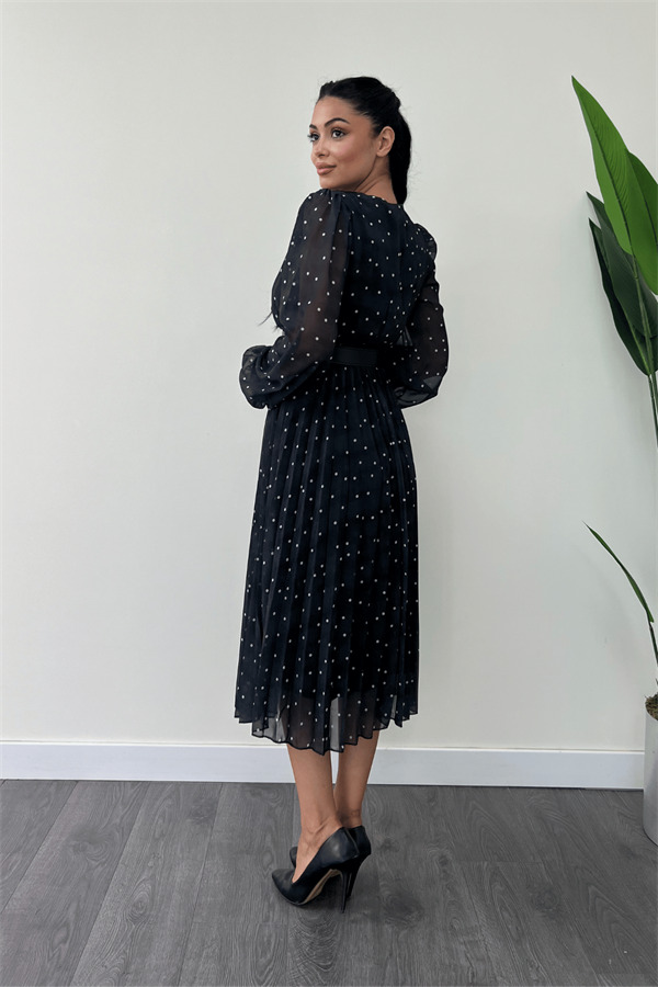 Şifon Kumaş Kruvaze Yaka Puantiye Detaylı Elbise - SİYAH