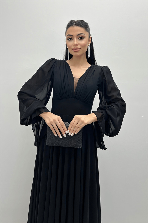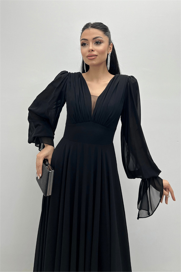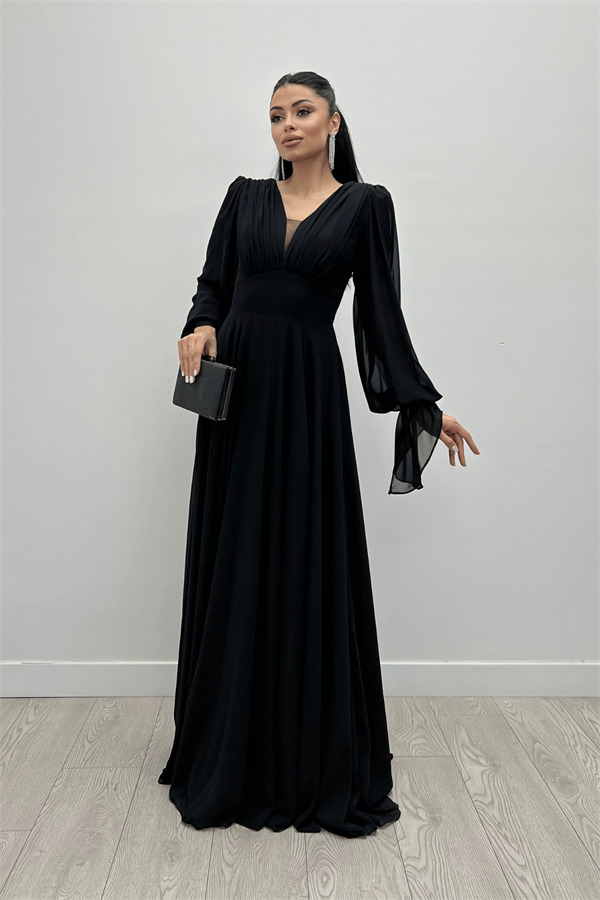 Şifon Kumaş V Yaka Büzgü Detaylı Maxi Elbise - SİYAH