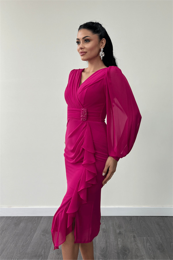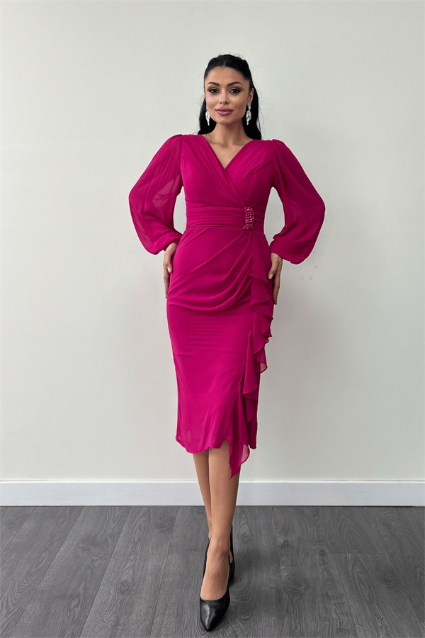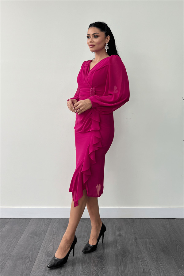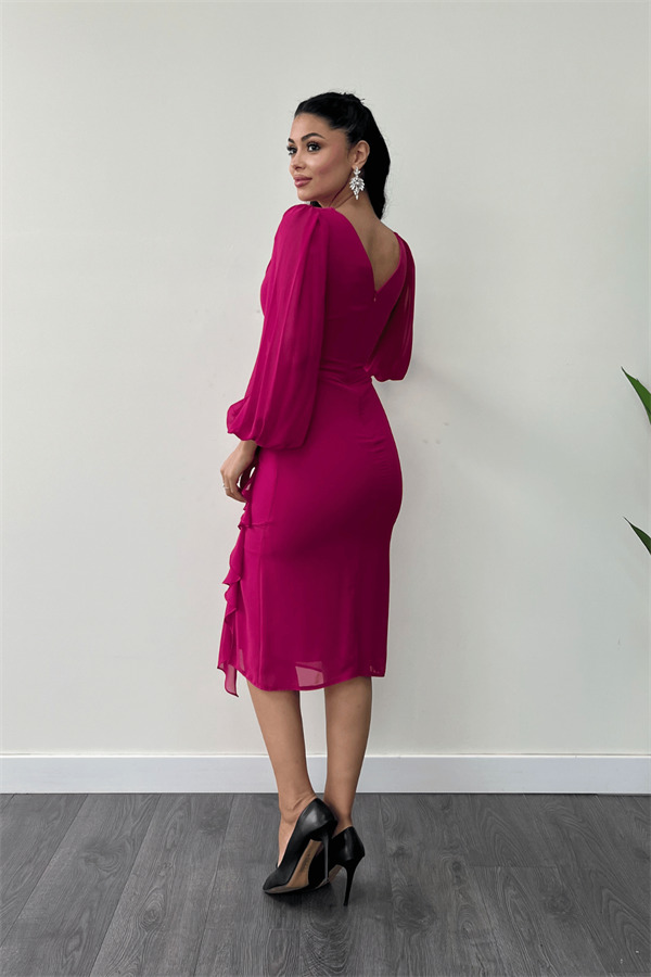 Şifon Kumaş Volan Detaylı Kalem Elbise - FUŞYA