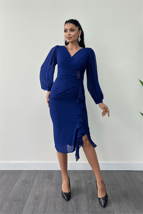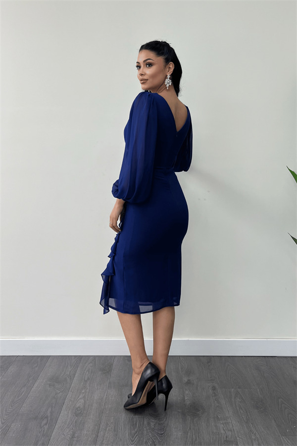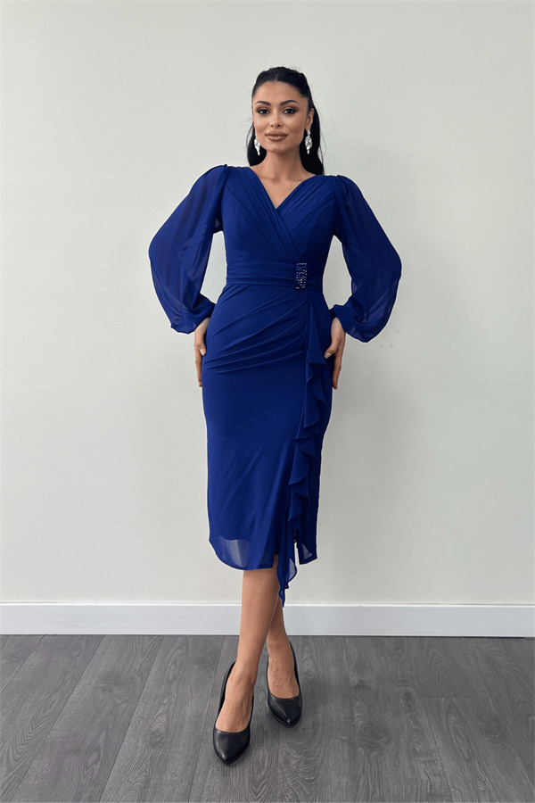 Şifon Kumaş Volan Detaylı Kalem Elbise - SAKS MAVİ