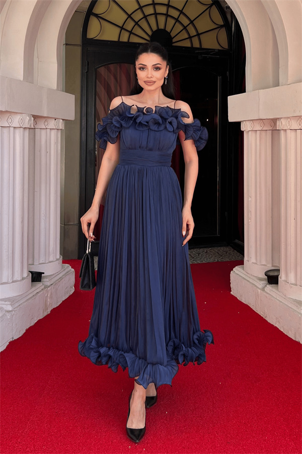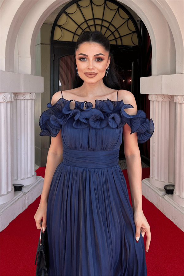 Şifon Kumaş Volan Detaylı Midi Elbise - LACİVERT