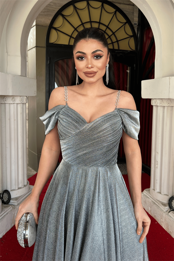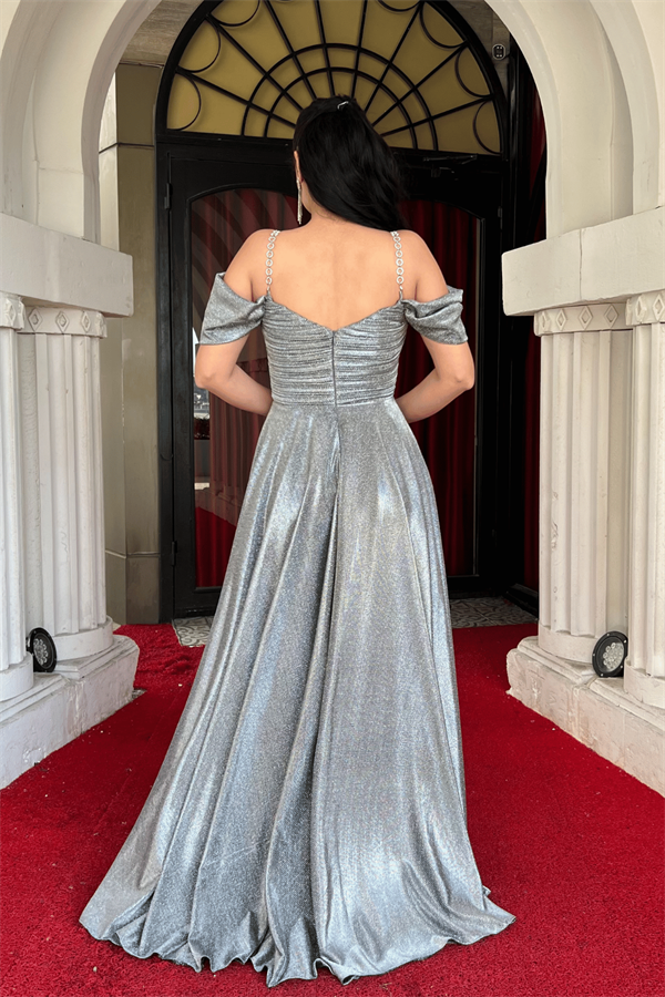 Simli Krep Kumaş Büzgülü Askılı Abiye Elbise - GÜMÜŞ