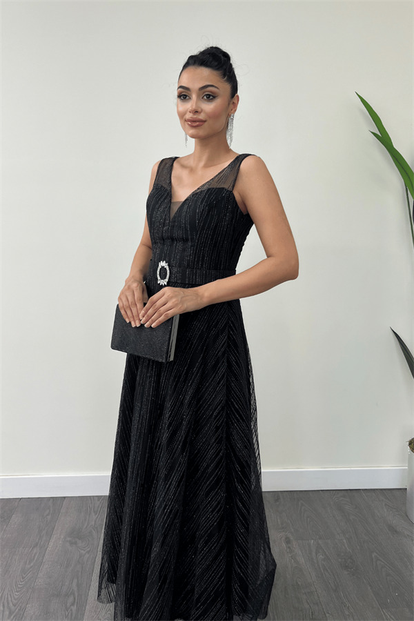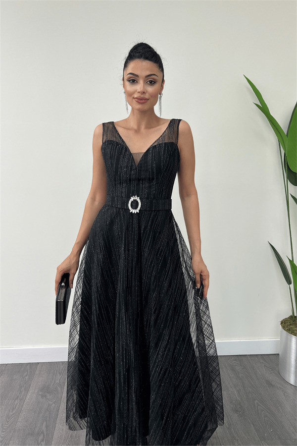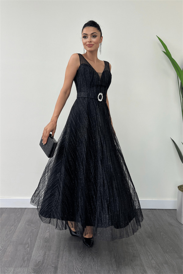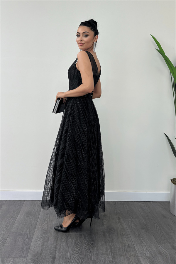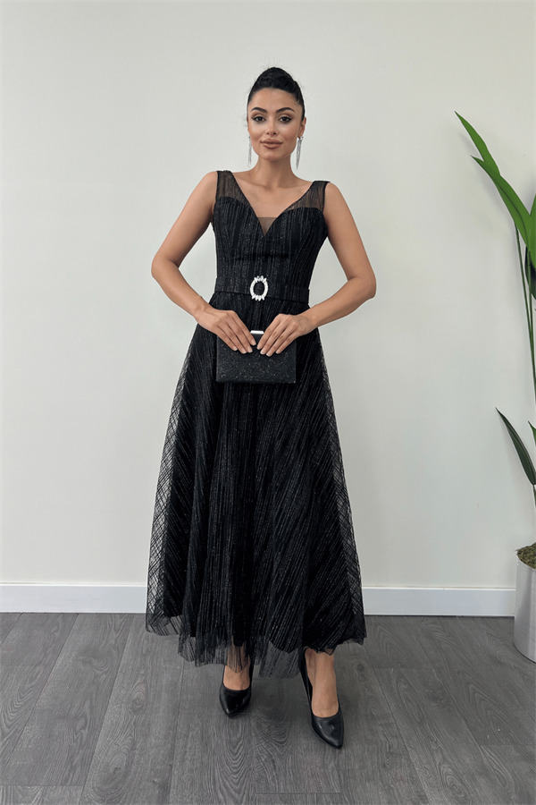 Simli Kumaş Askılı Midi Elbise - SİYAH