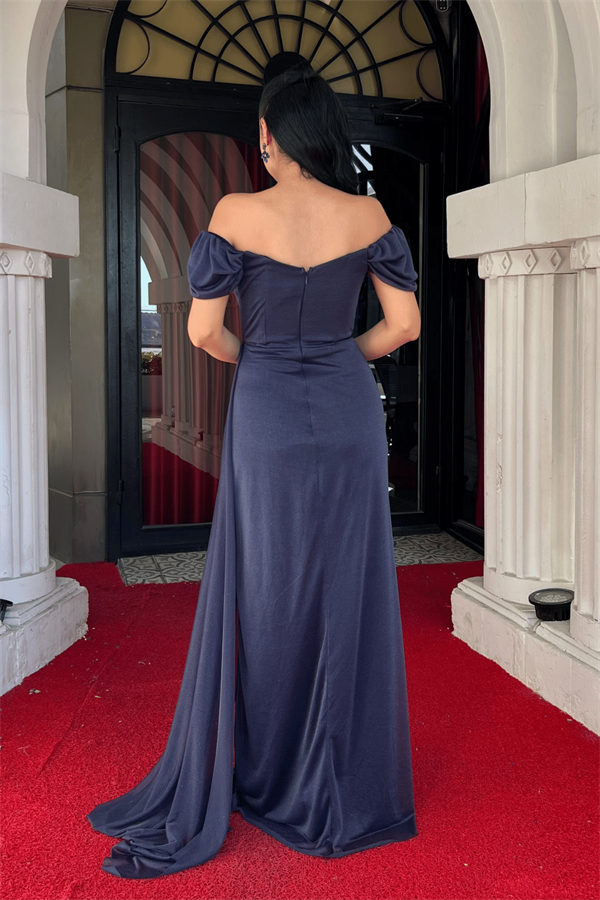Simli Kumaş Büzgü Detaylı Balık Abiye Elbise - LACİVERT