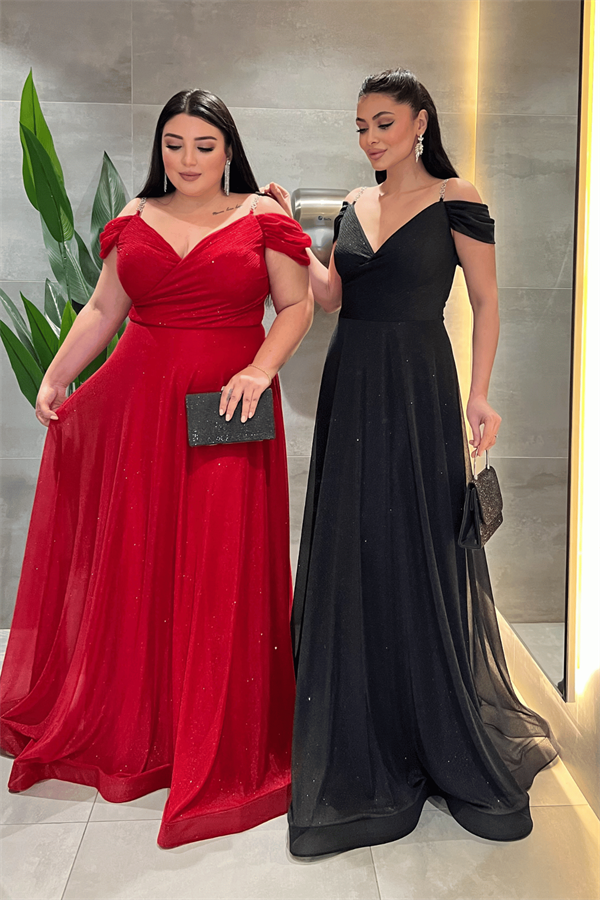 Simli Kumaş Kayık Yaka Abiye Elbise - KIRMIZI