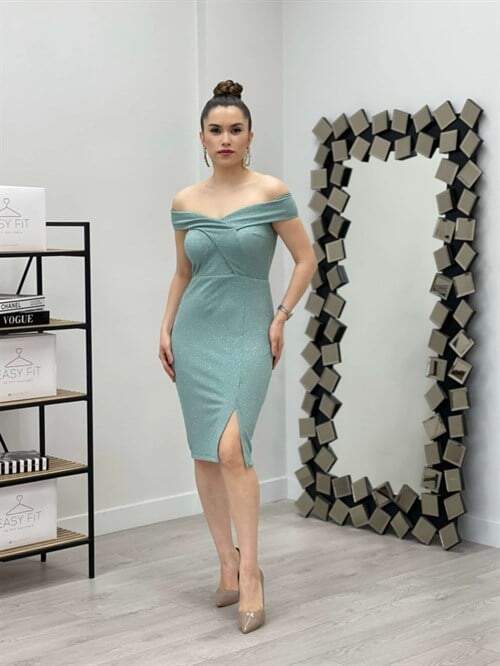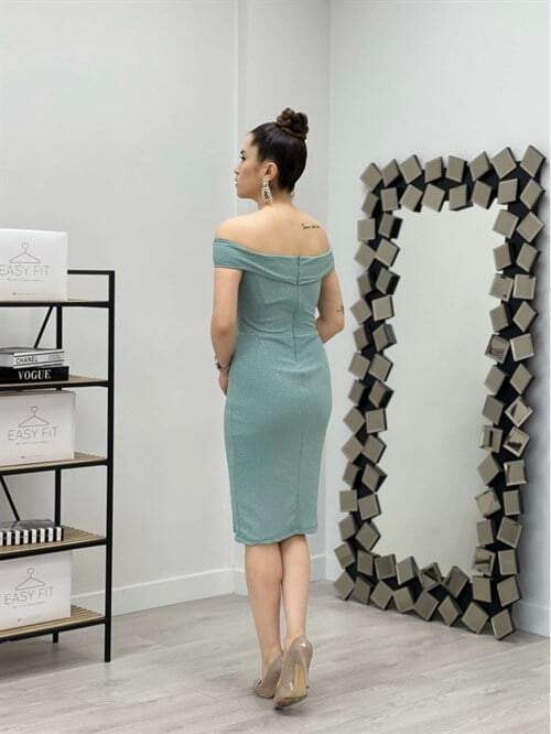 Simli Kumaş Kayık Yaka Elbise - MİNT YEŞİL