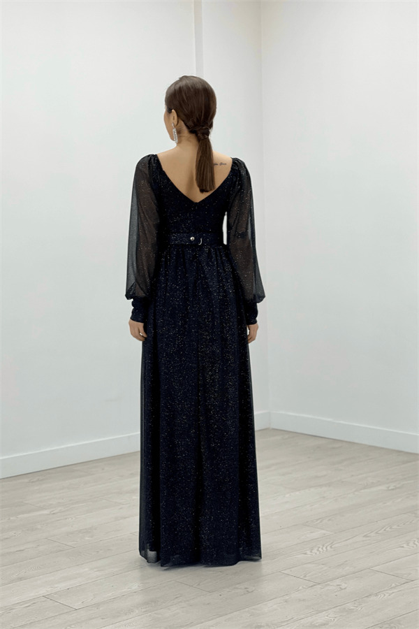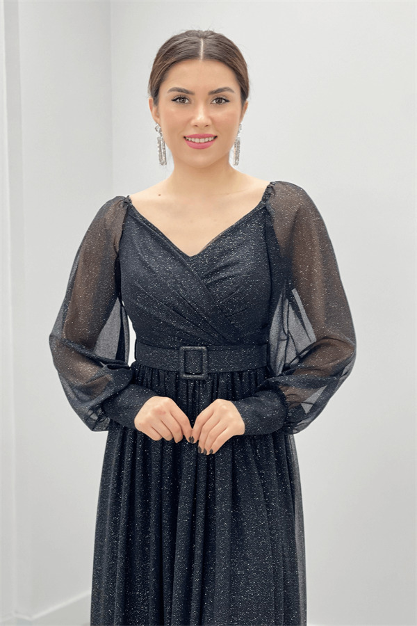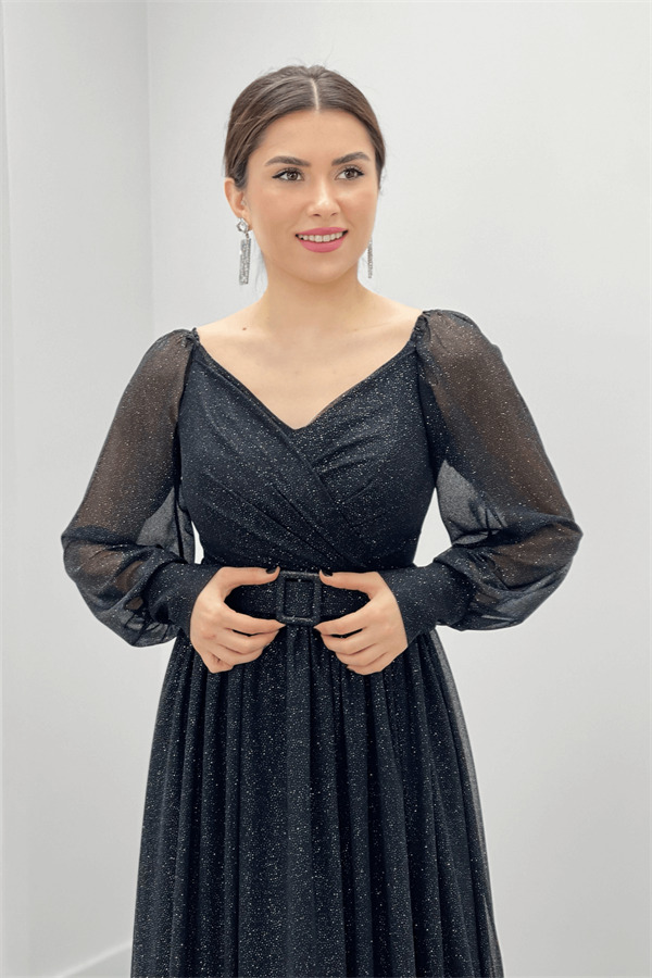 Simli Kumaş Kemerli Abiye Elbise - SİYAH