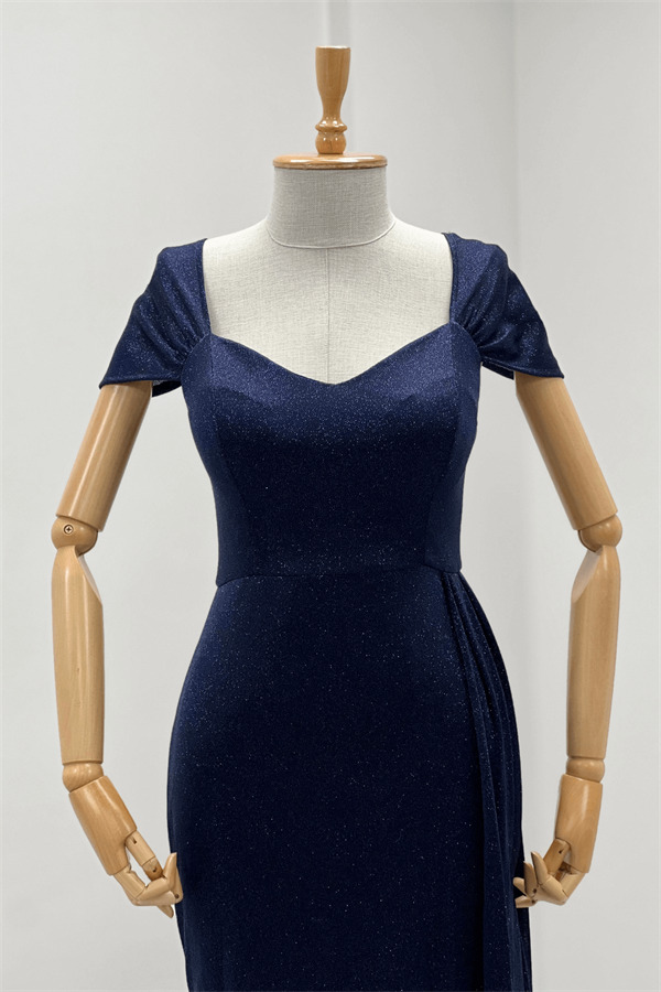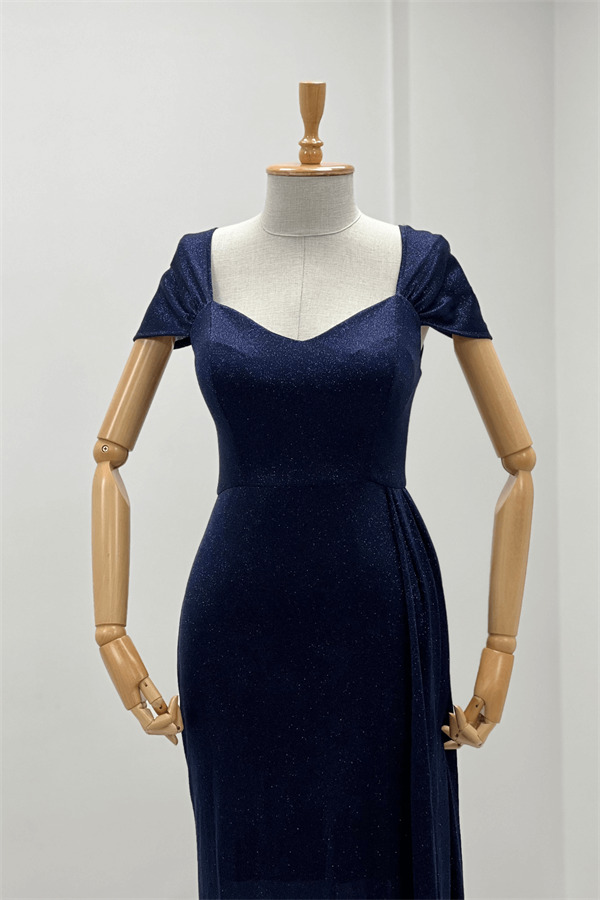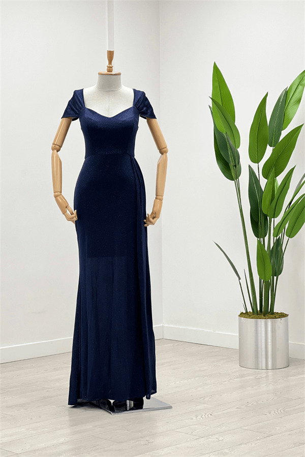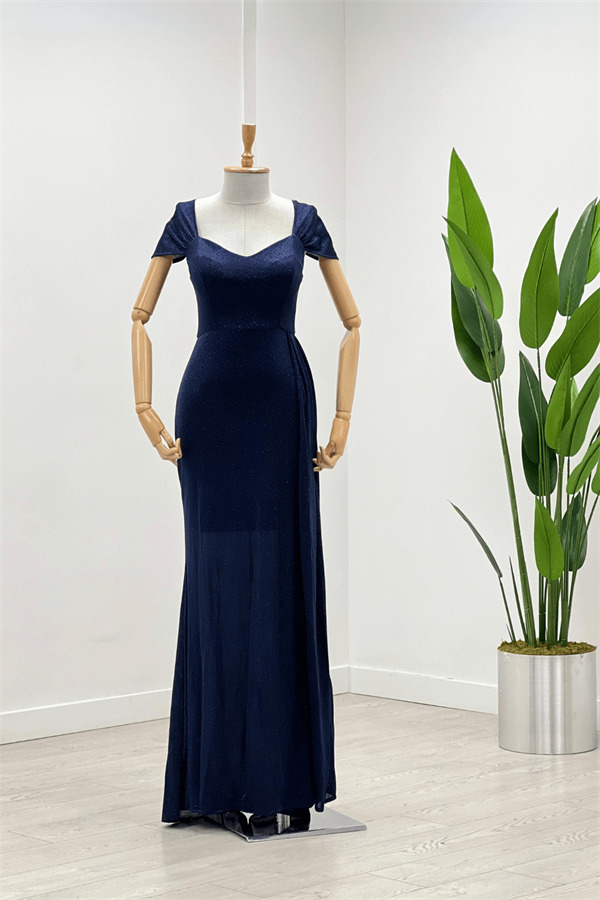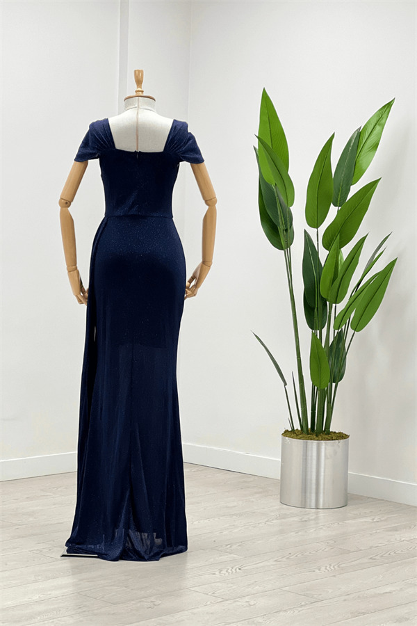 Simli Kumaş Omu Büzgülü Uzun Elbise - LACİVERT