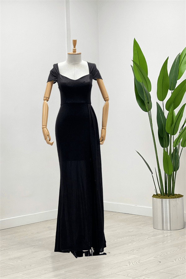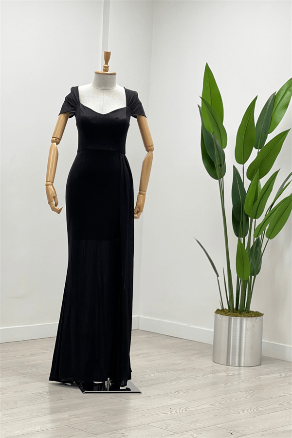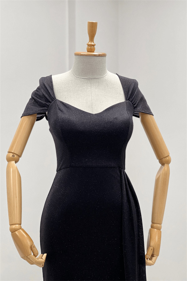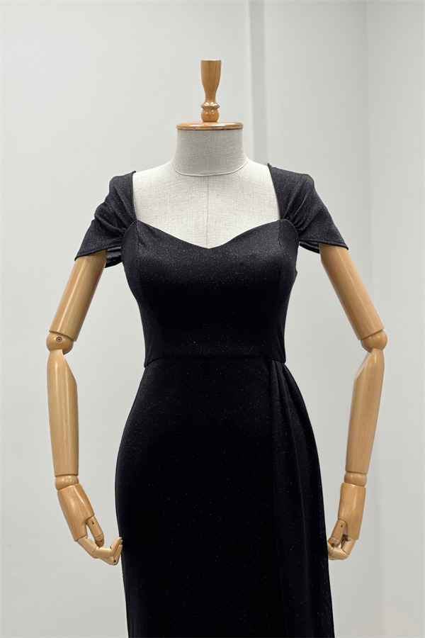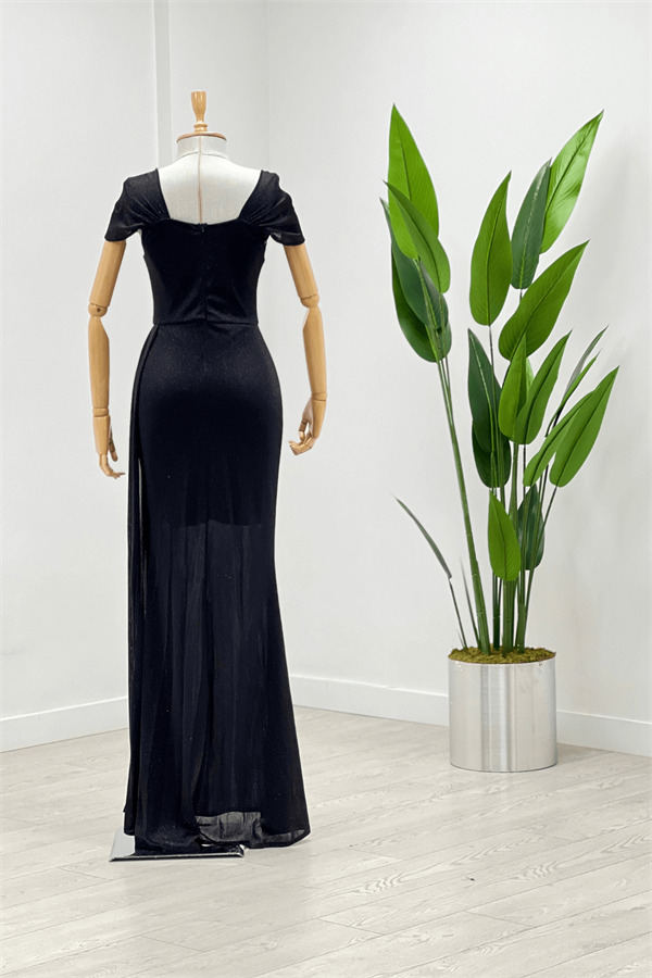 Simli Kumaş Omu Büzgülü Uzun Elbise - SİYAH