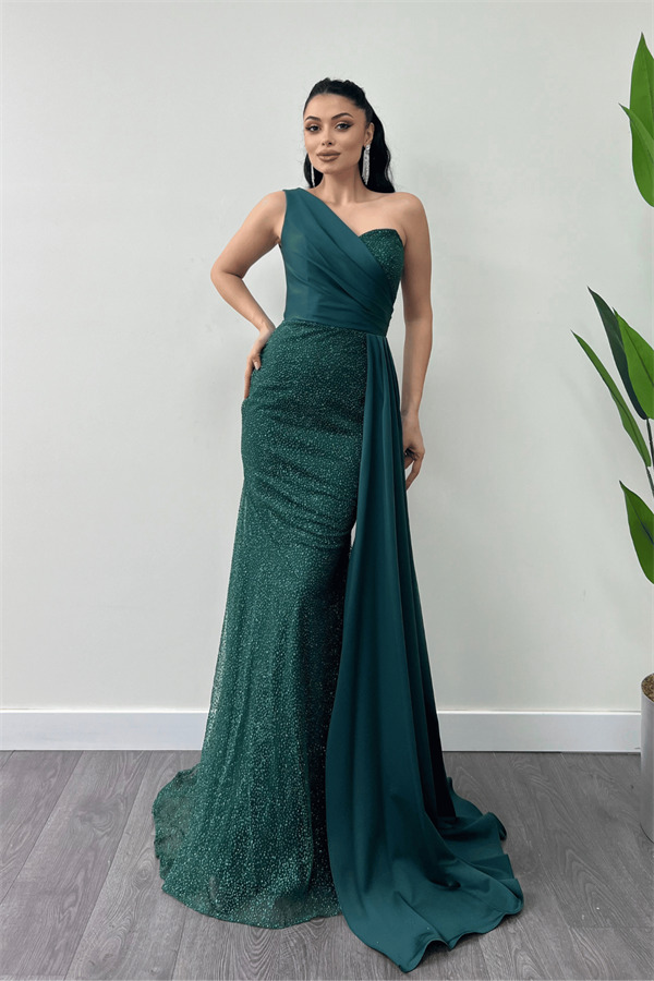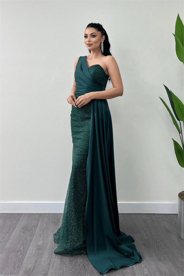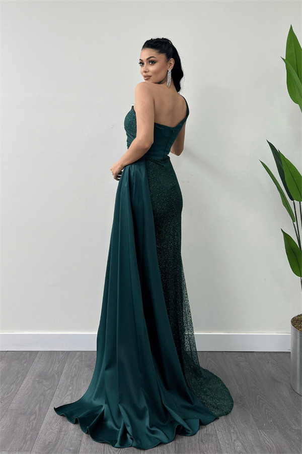 Simli Saten Kumaş Şal Detaylı Abiye Elbise - ZÜMRÜT YEŞİL