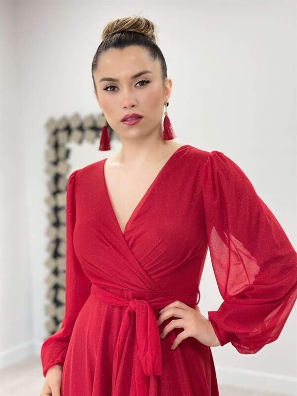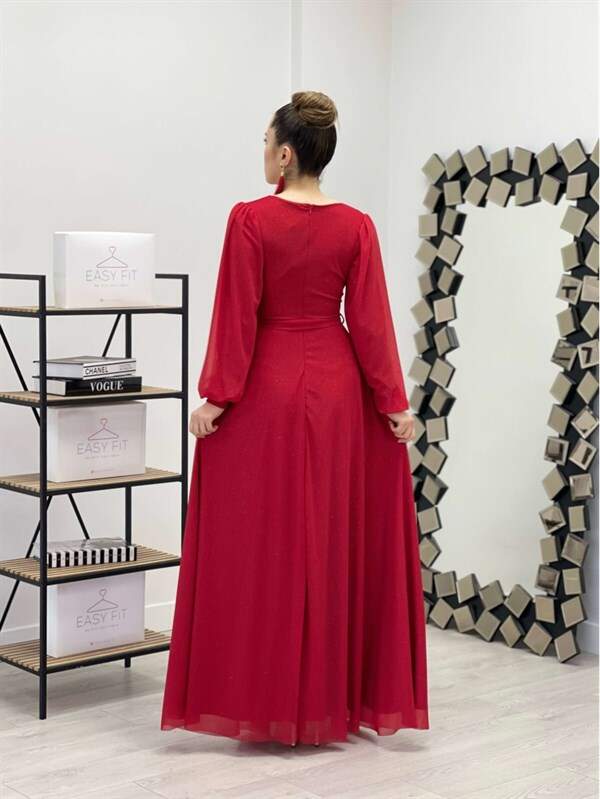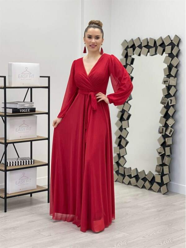 Simli Tül Kumaş Kuşaklı Kiloş Elbise