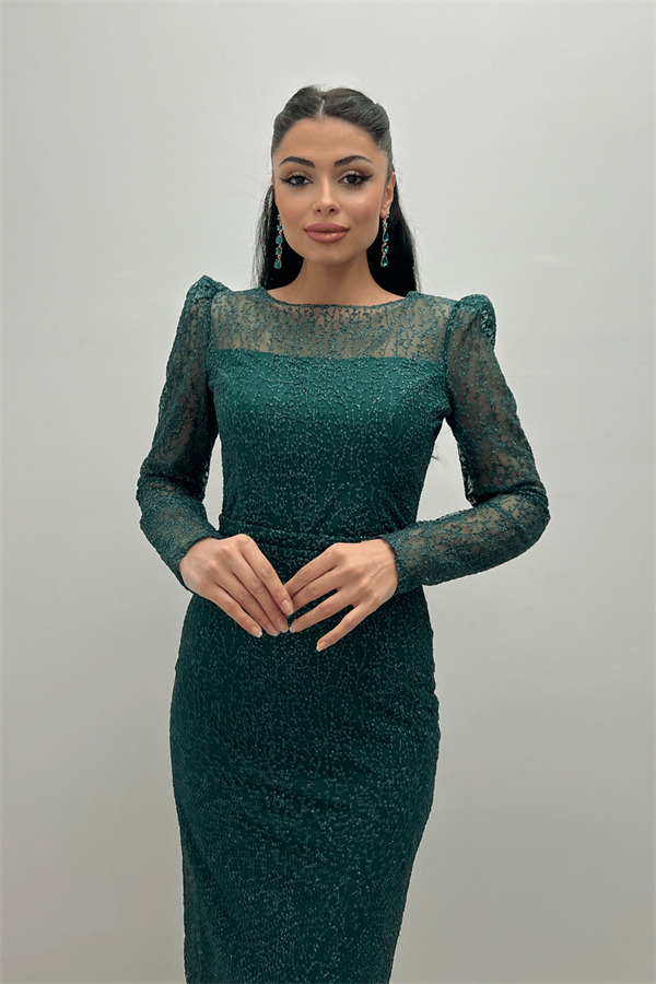 Simli Tül Kumaş Yuvarlak Yaka Kalem Elbise - ZÜMRÜT YEŞİL