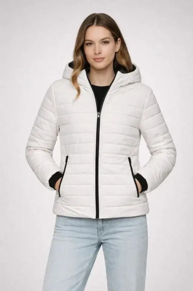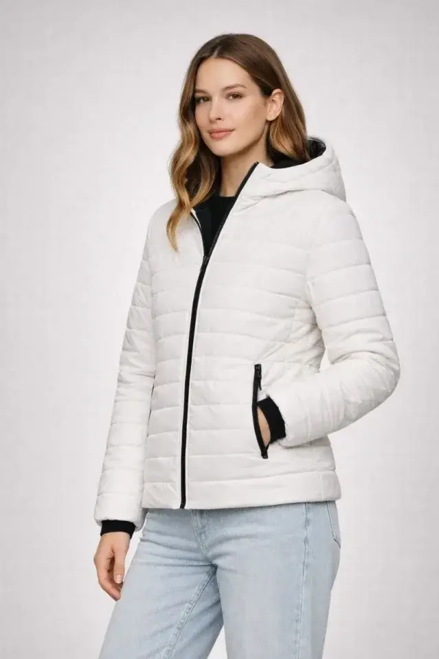 Şişme Kapüşonlu Fermuarlı Mont Su Itici Kapitone Astarlı Kumaş Cepli Kışlık Rahat Kalıp - Krem