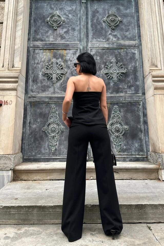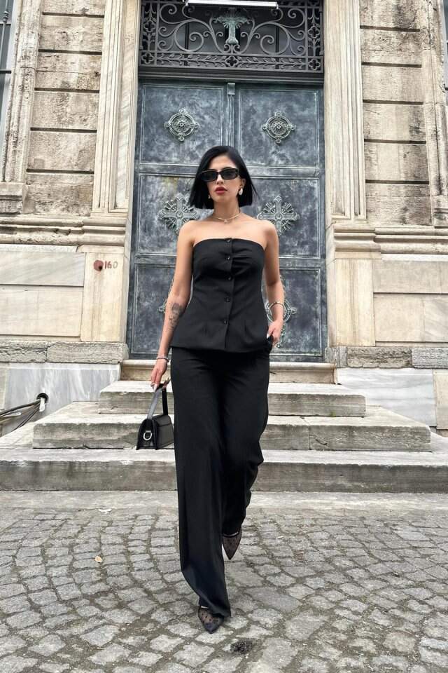 Siyah Straplez Düğmeli Crop Ve Pantolon Takım