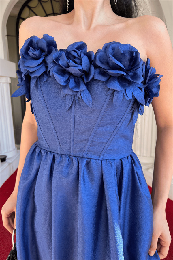 Tafta Kumaş Gül Balen Detaylı Abiye Elbise - SAKS MAVİ