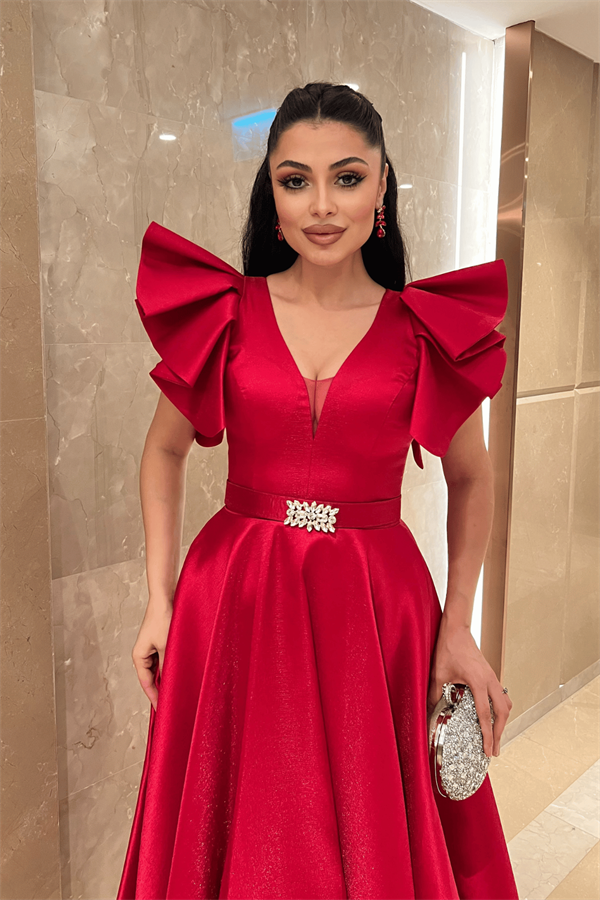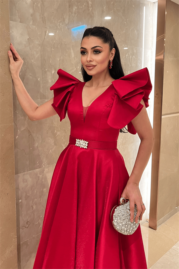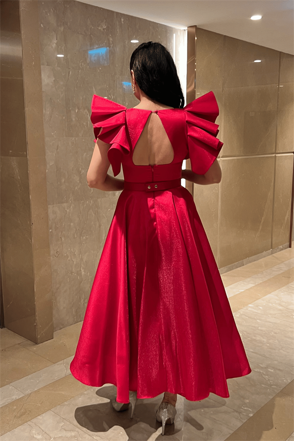 Tafta Kumaş Omuz Volanlı Midi Boy Elbise - KIRMIZI